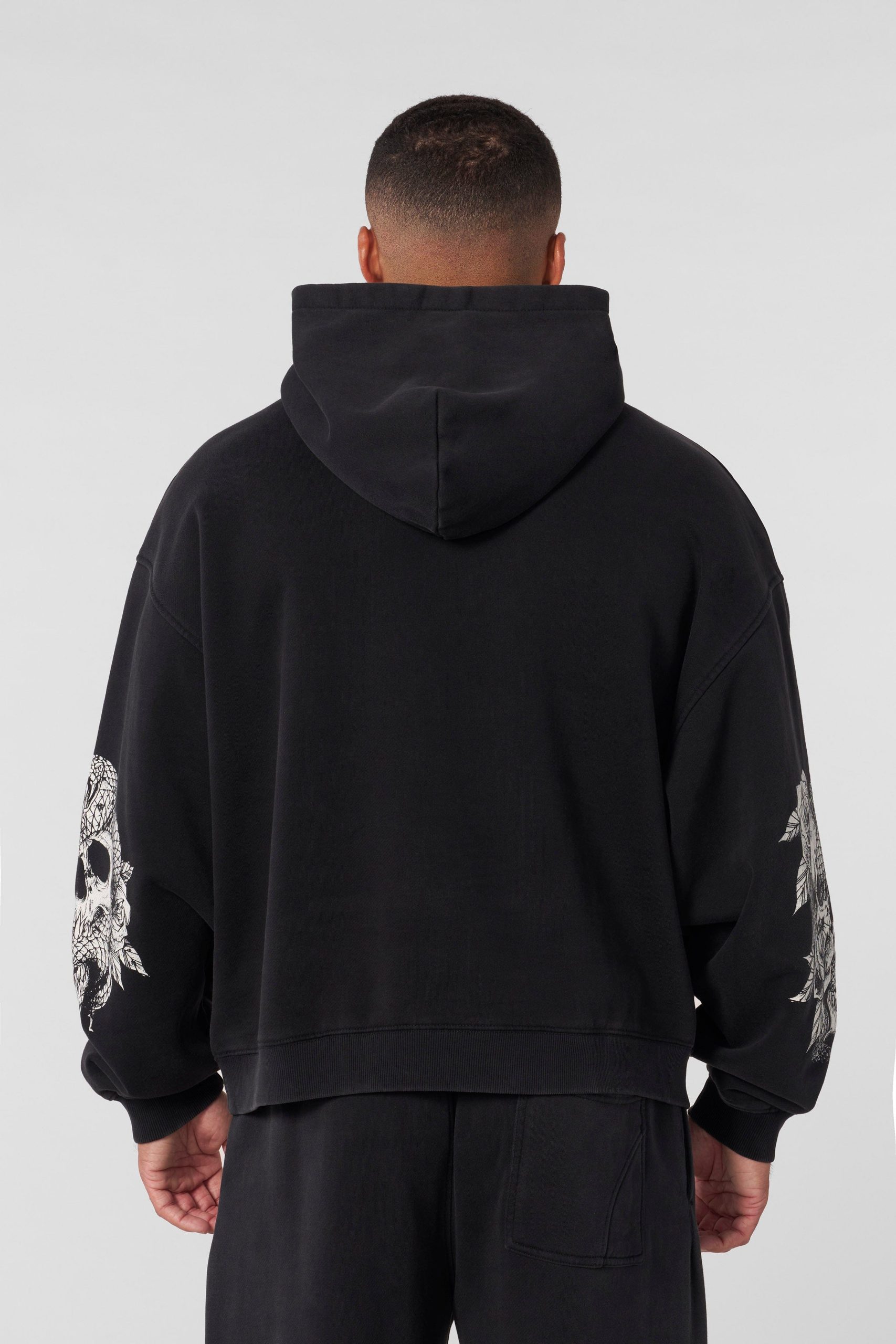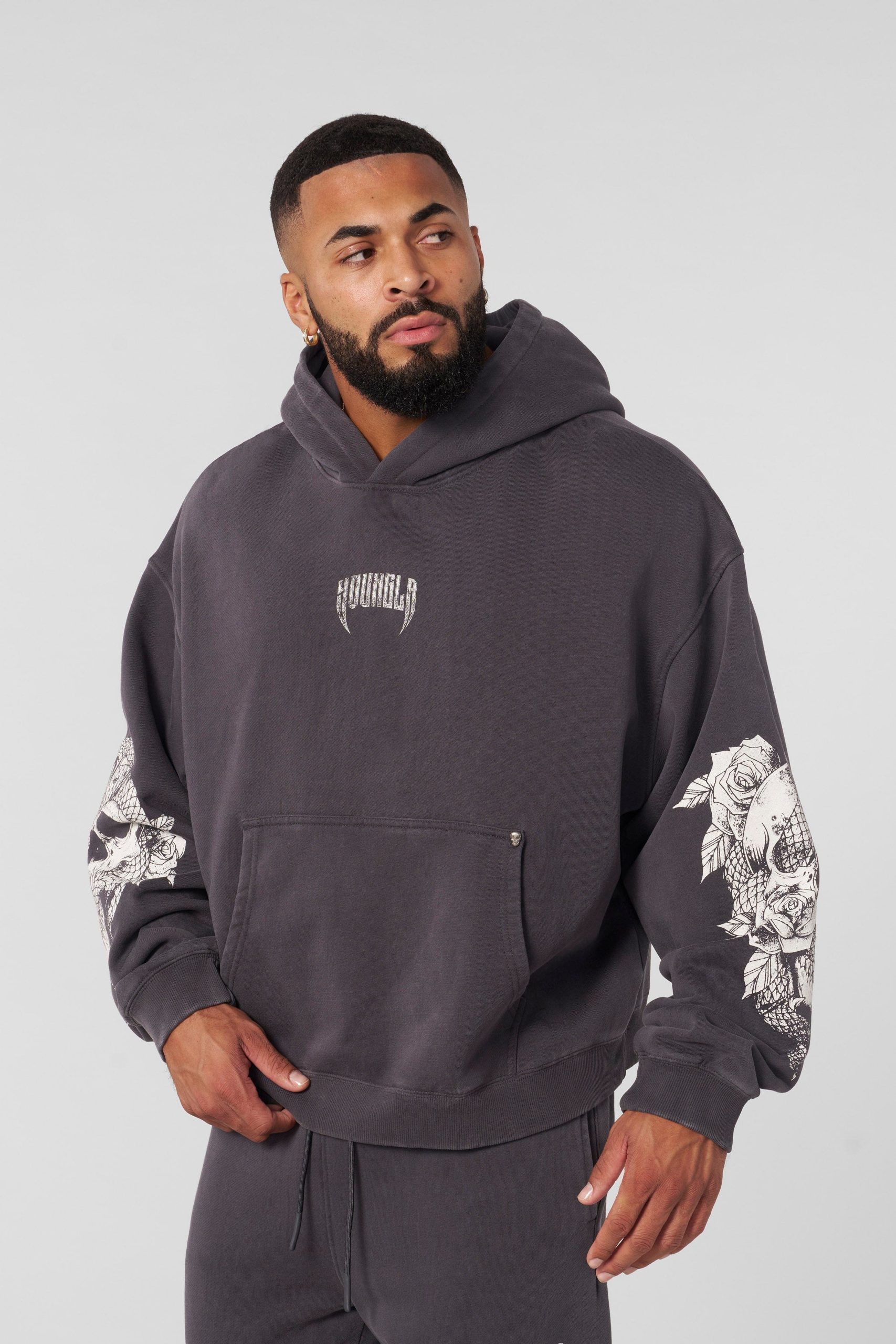DESIGN: This loose-fit pullover hoodie combines comfort and bold design with intricate skull prints on each sleeve. Made for a relaxed fit, it features a spacious front pocket and a subtle logo on the chest, making it a perfect choice for staying cozy while keeping your streetwear style on point.